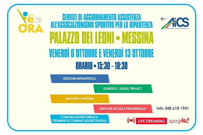 L’attualissima Riforma dello Sport, entrata recentemente in vigore, sarà al centro dei due incontri del progetto “E’ ORA! Servizi di aggiornamento e assistenza all’associazionismo sportivo per la ripartenza – edizione 2022-2024”, che si terrano, nei pomeriggi (ore 15.30/18.30) di venerdì 6 e 13 ottobre, nel Salone degli Specchi del Palazzo dei Leoni, sede della Città Metropolitana di Messina.